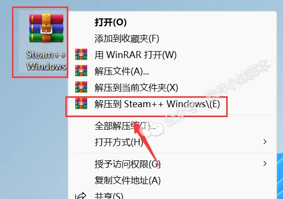 1.解压安装包:鼠标右击【Steam++ Windows】压缩包,选择电脑上安装的解压软件,点击【解压到Steam++ Windows】。