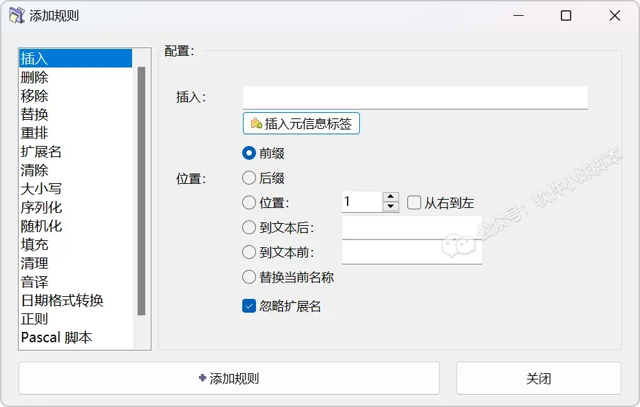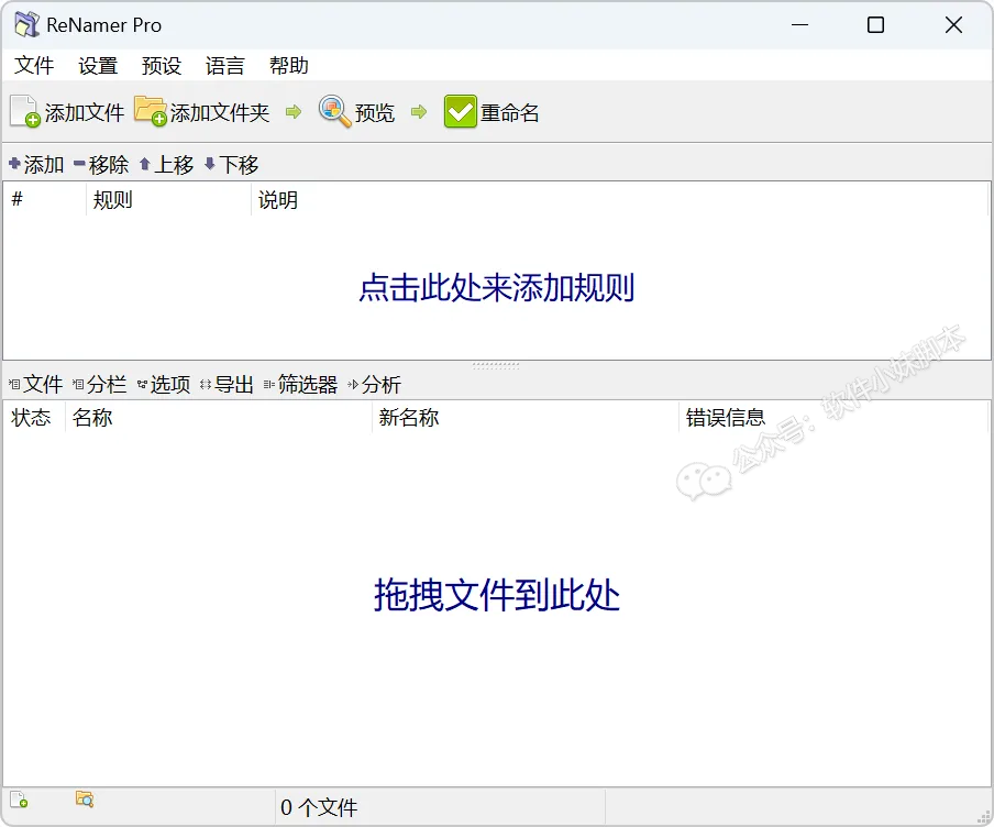 该程序支持包括插入、删除、移除、替换、前缀、后缀以及正则表达式等十四种重命名规则。只需要将待重命名的单个或者大量文件拖放到文件窗口,接着再指定一个重命名规则便可以轻松执行重命名操作。
