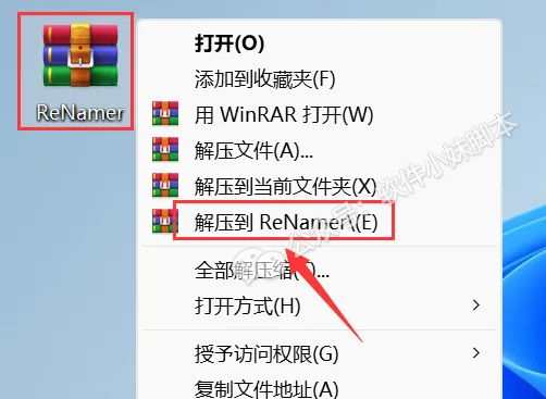 1.解压安装包:鼠标右击【ReNamer】压缩包,选择电脑上安装的解压软件,点击【解压到ReNamer】。