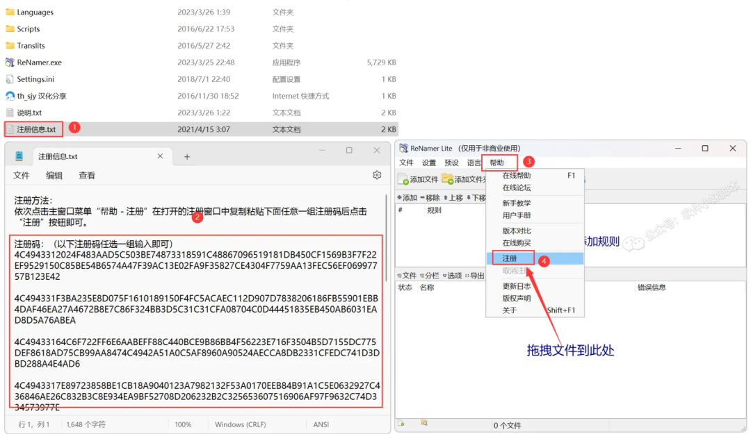 如果软件没有注册,打开文件夹中的【注册信息】文本,依次点击主窗口菜单“帮助 - 注册”,在打开的注册窗口中复制粘贴任意一组注册码后点击“注册”按钮即可。